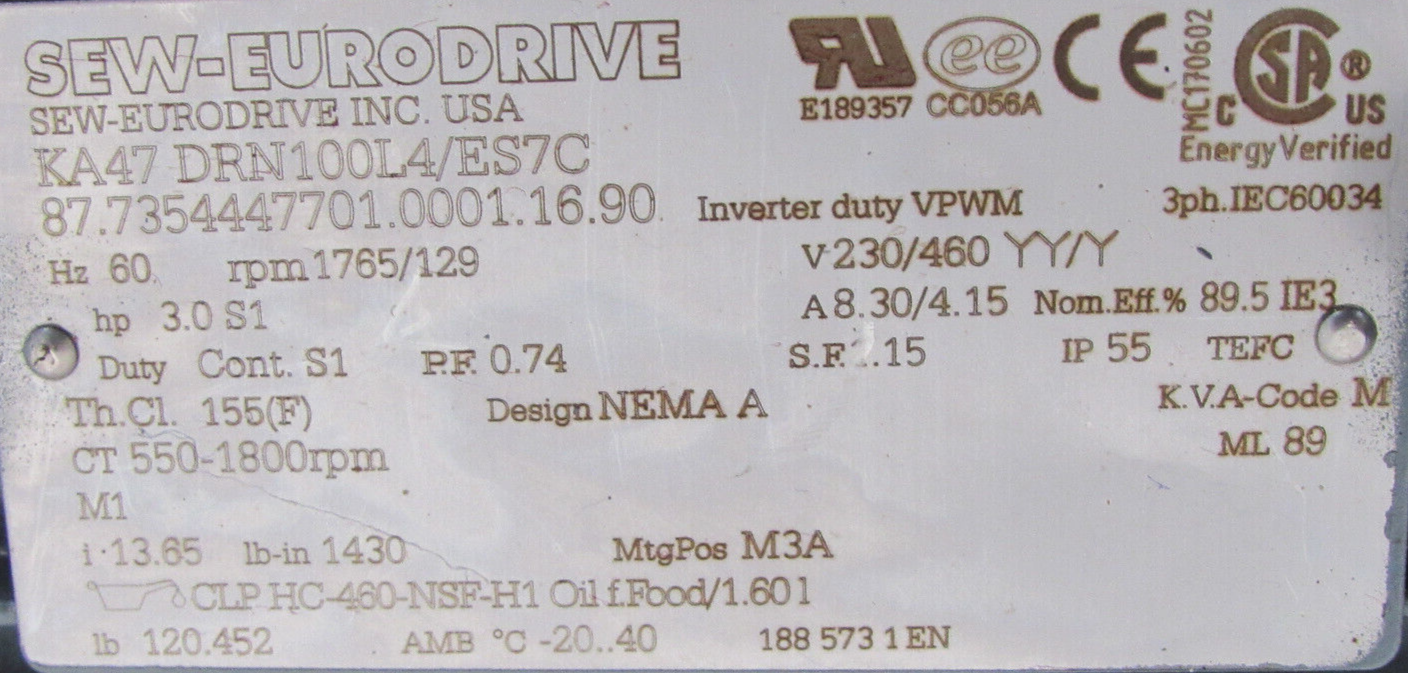 NEW SEW EURODRIVE KA47 DRN100L4/ES7C GEARMOTOR 13.65 KA47DRN100L4ES7C