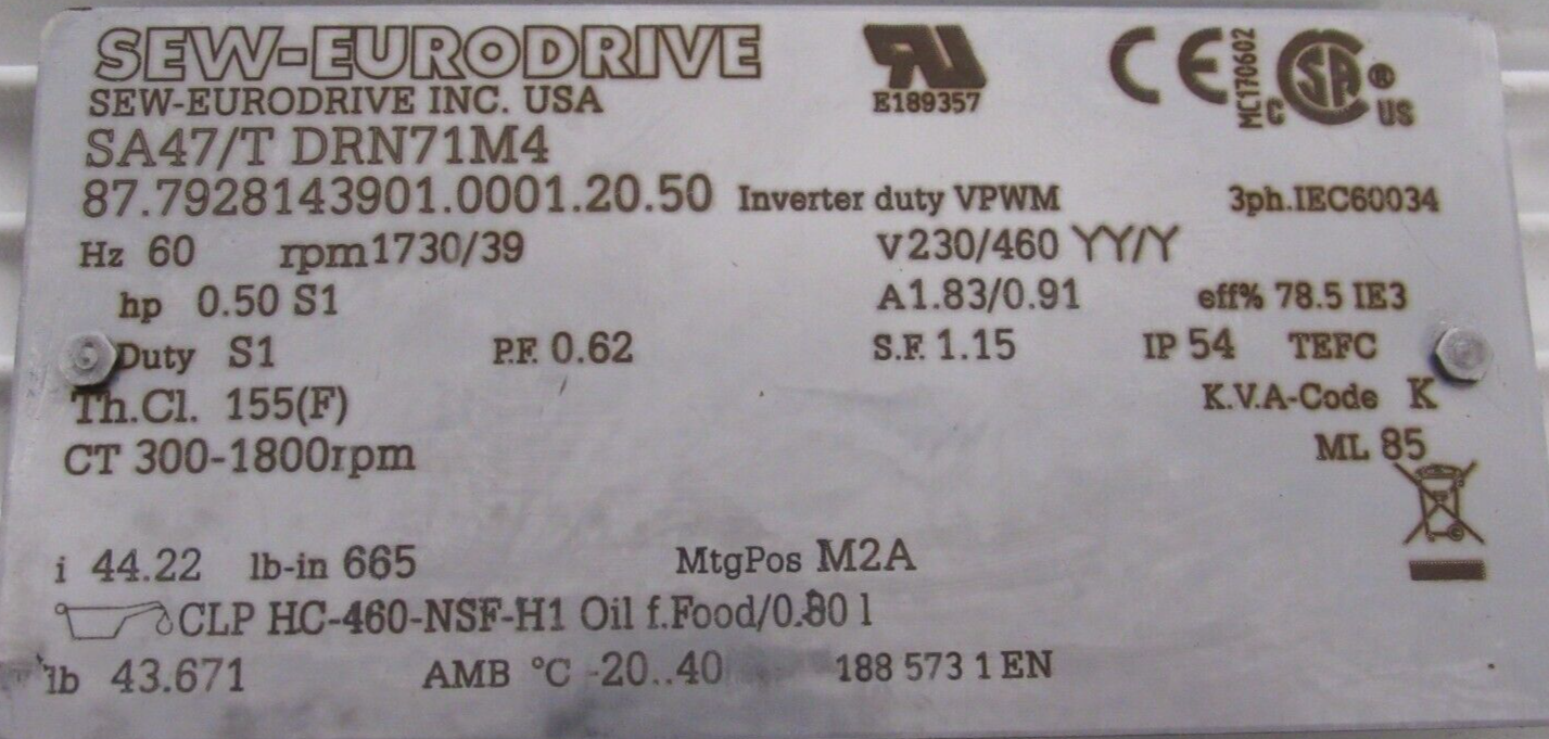 NEW SEW EURODRIVE SA47/T DRN71M4 GEAR .5HP 230/460V SA47TDRN71M4