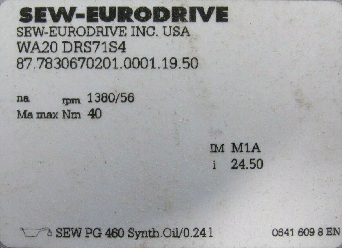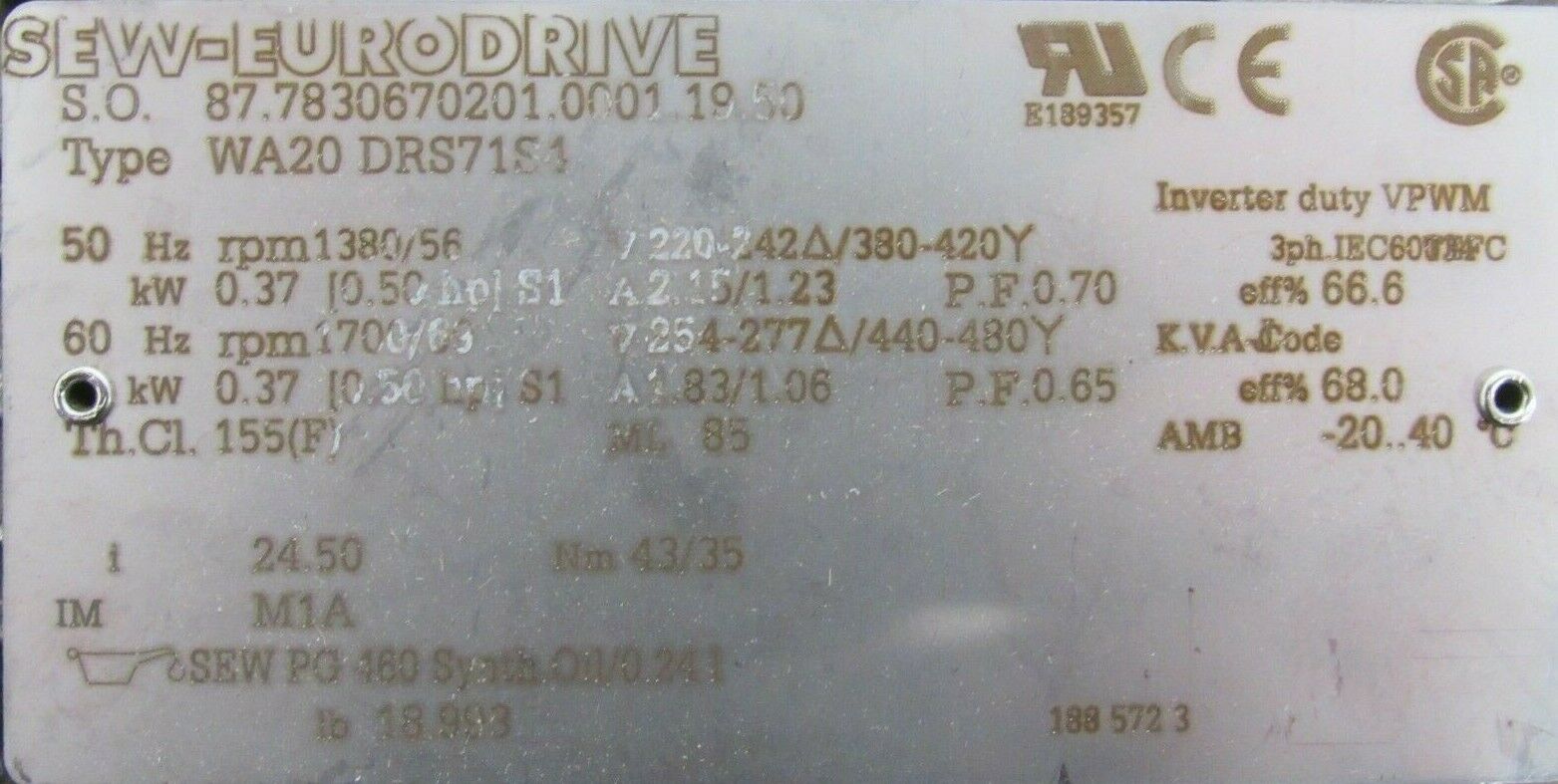 NEW SEW EURODRIVE WA20-DRS71S4 GEARMOTOR .5HP RPM 1380/56 WA20DRS71S4