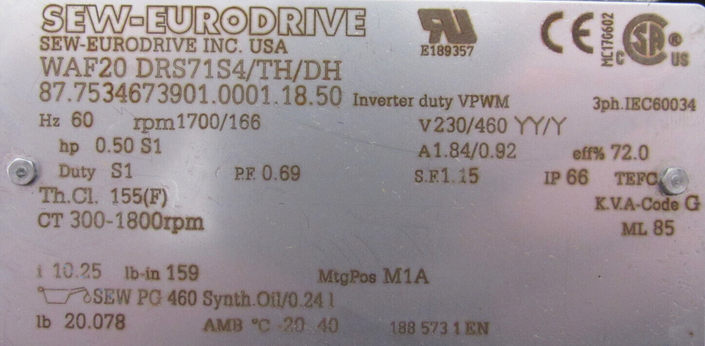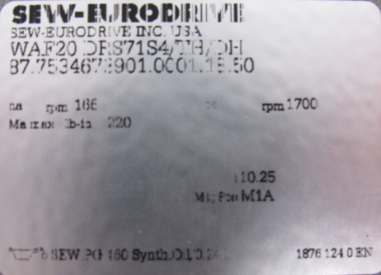 NEW SEW EURODRIVE WAF20DRS71S4/TH/DH GEARMOTOR 10.25:1 230/460V