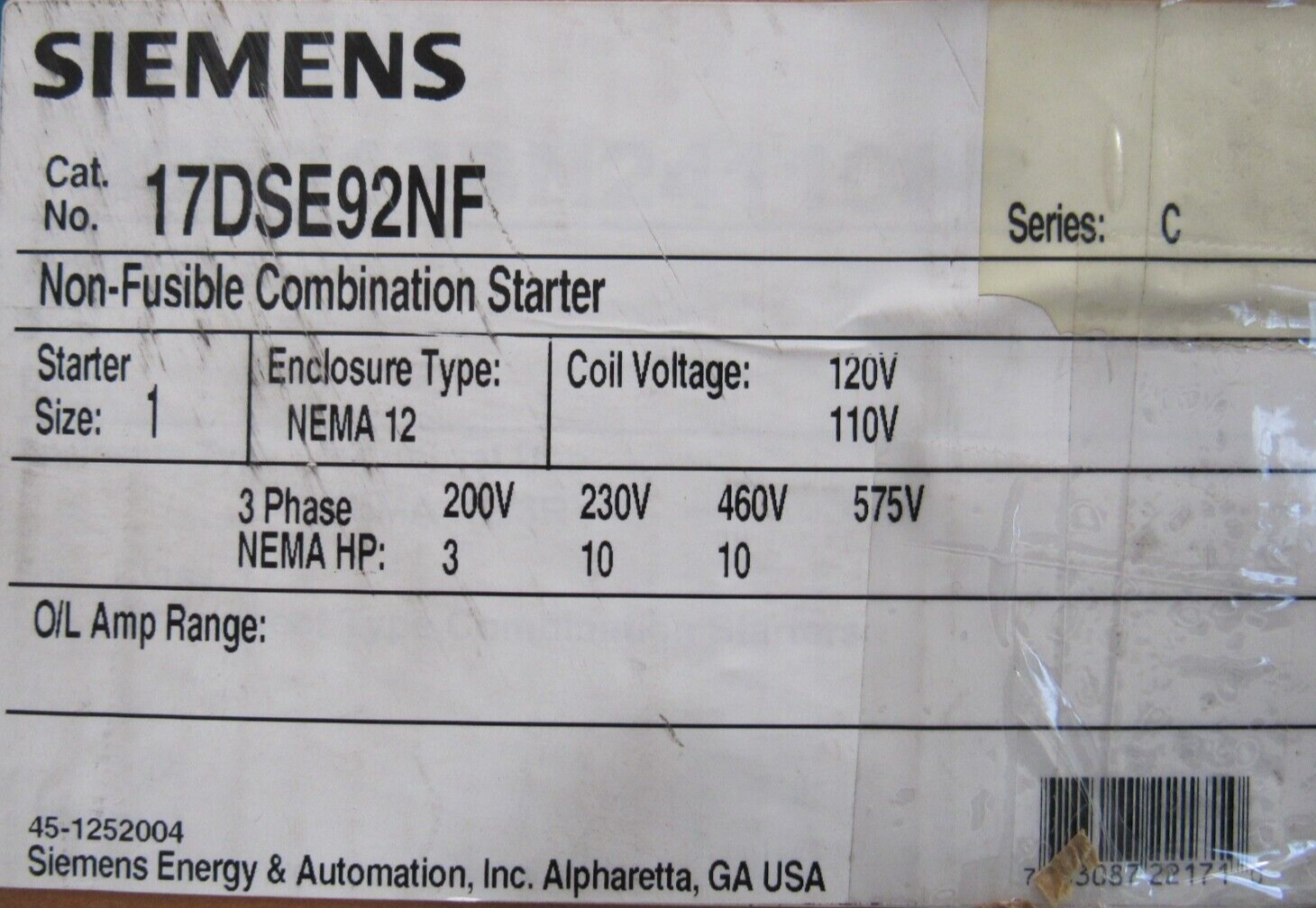 NEW SIEMENS 17DSE92NF COMBINATION STARTER 14DS+32A 49EC17BN241108R SIZE 1