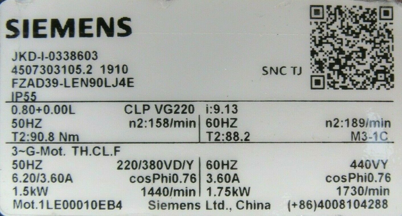 NEW SIEMENS 1LE00010EB4 GEARMOTOR FZAD39-LEN90LJ4E CLP-VG220 JKD-I-0338603