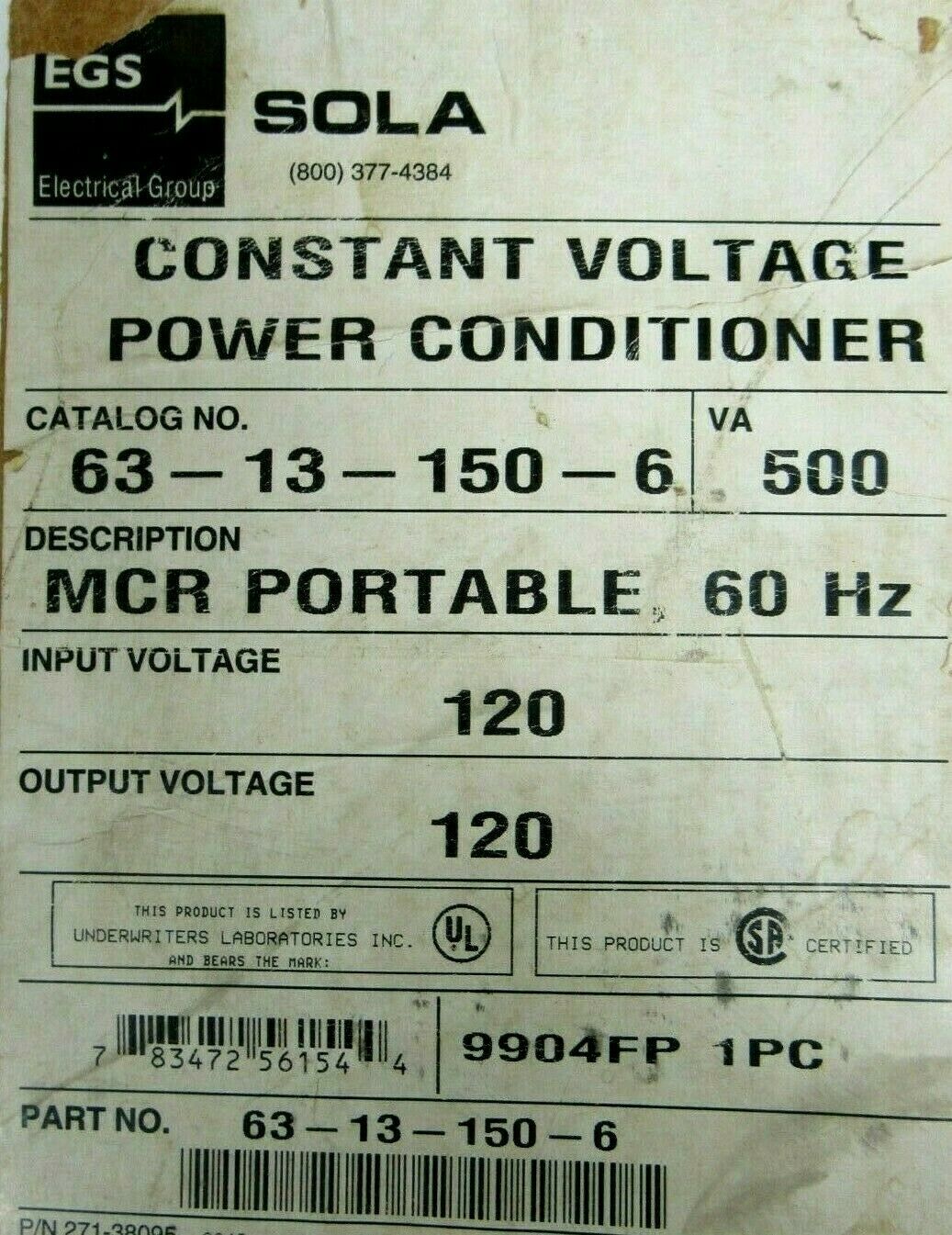 NEW SOLA 63-13-150-06 CONSTANT VOLTAGE POWER CONDITIONER 631315006NEW, NO BOX