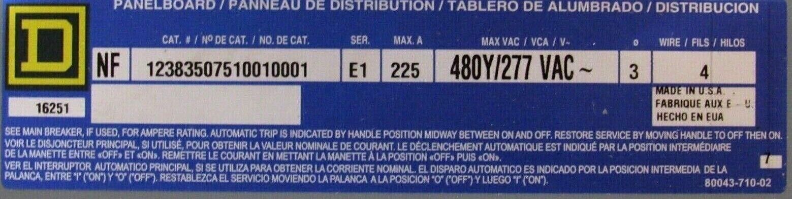 NEW SQUARE D 12383507510010001 PANELBOARD 225A 480Y/277VAC SER.E1 38350751-001