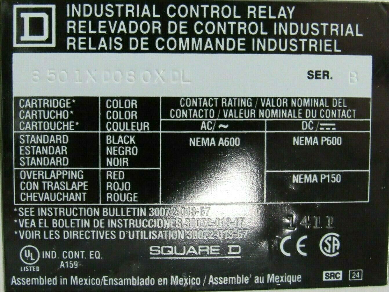 NEW SQUARE D 8501XDO80XDLV62 CONTROL RELAY SER. B