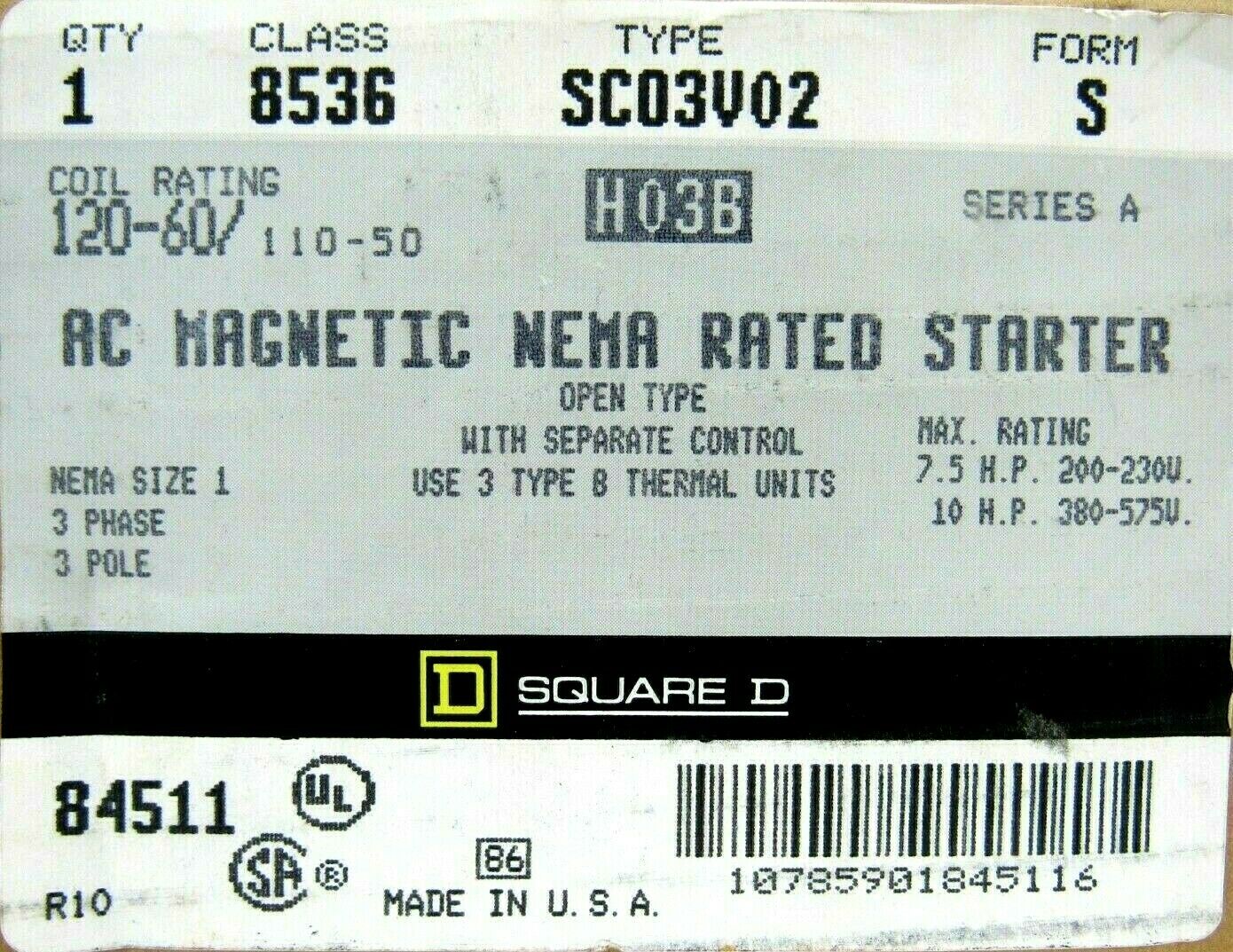 NEW SQUARE D 8536-SC03V02-S STARTER SIZE 1 SER A 8536SC03V02S