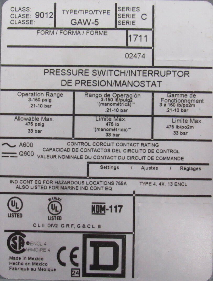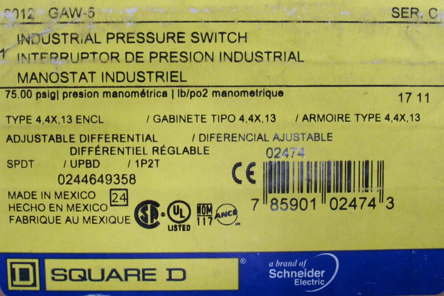 NEW SQUARE D 9012-GAW-5 PRESSURE SWITCH SER.C 9012GAW5