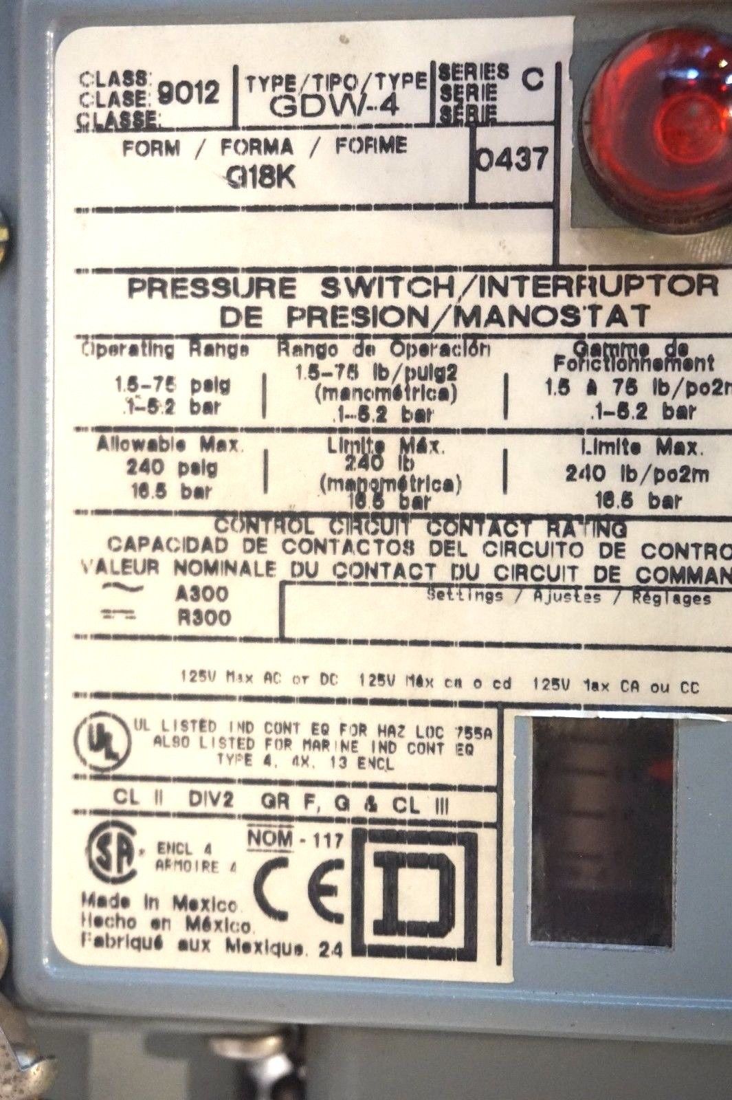 NEW SQUARE D 9012-GDW-4 PRESSURE SWITCH SER.C 9012GDW4 NEW, NO BOX