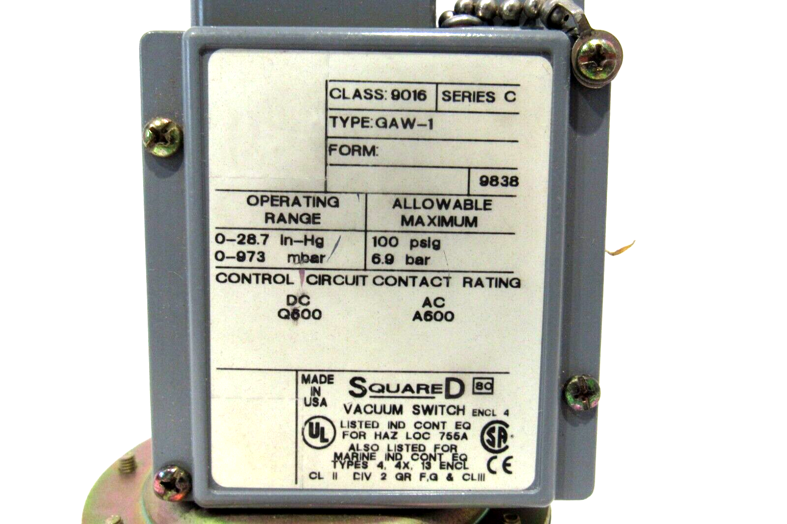 NEW SQUARE D 9016-GAW-1 VACUUM SWITCH 9016GAW1