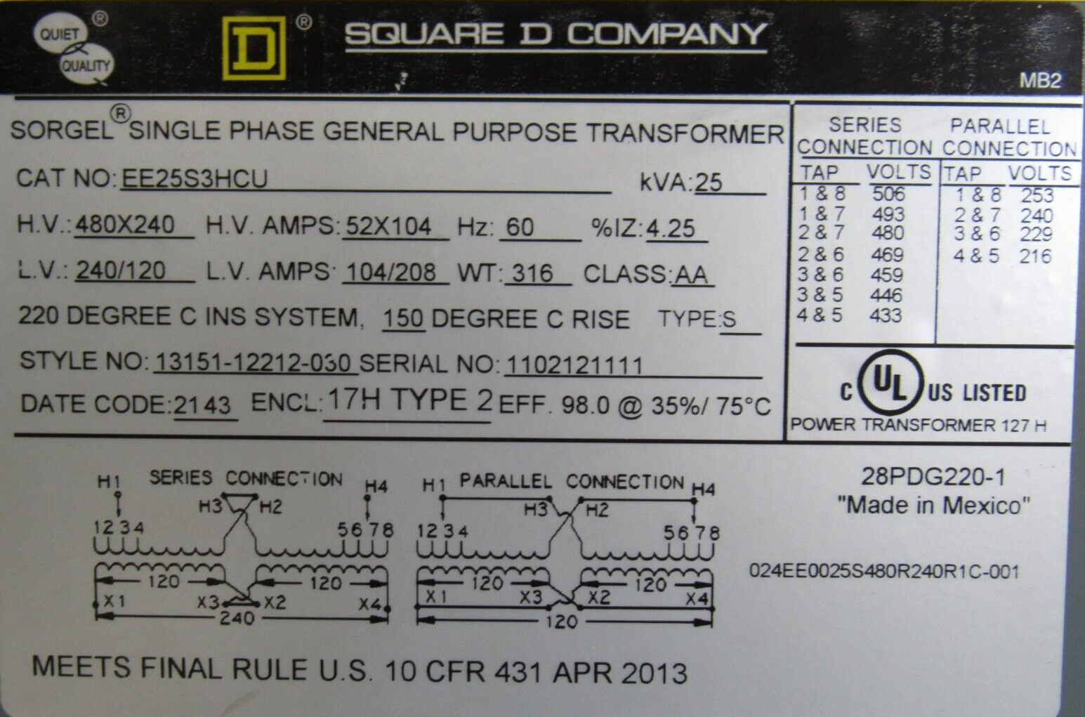 NEW SQUARE D EE25S3HCU TRANSFORMER DRY TYPE 1PH 25KVA 240X480V120/240$16,000.00 Only 1 left in stock NEW SQUARE D EE25S3HCU TRANSFORMER DRY TYPE 1PH 25KVA 240X480V120/240 quantity Add to cart SKU: 175703757377 Category: Other Description Additional information Description NEW SQUARE D EE25S3HCU TRANSFORMER DRY TYPE 1PH 25KVA 240X480V120/240 B2/ BB Additional information Weight 340.00 lbs Brand SQUARE D MPN EE25S3HCU Country/Region of Manufacture Mexico We Buy New and Used Surplus Inventory - Sell to Us