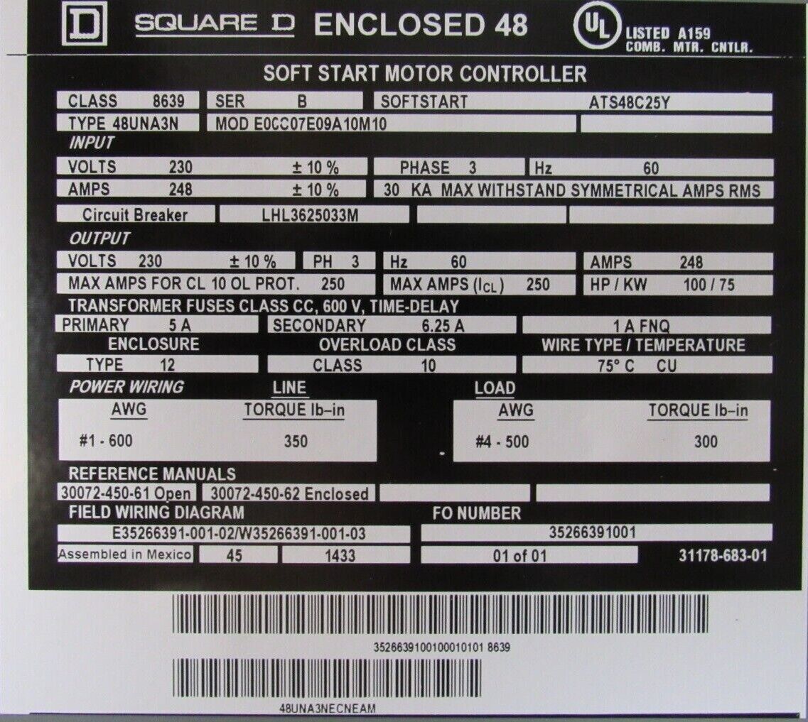 NEW SQUARE D ENCLOSED 48 MOTOR CONTROLLER 100HP 48UNA3NECNEAM 8639 ATS48C25Y