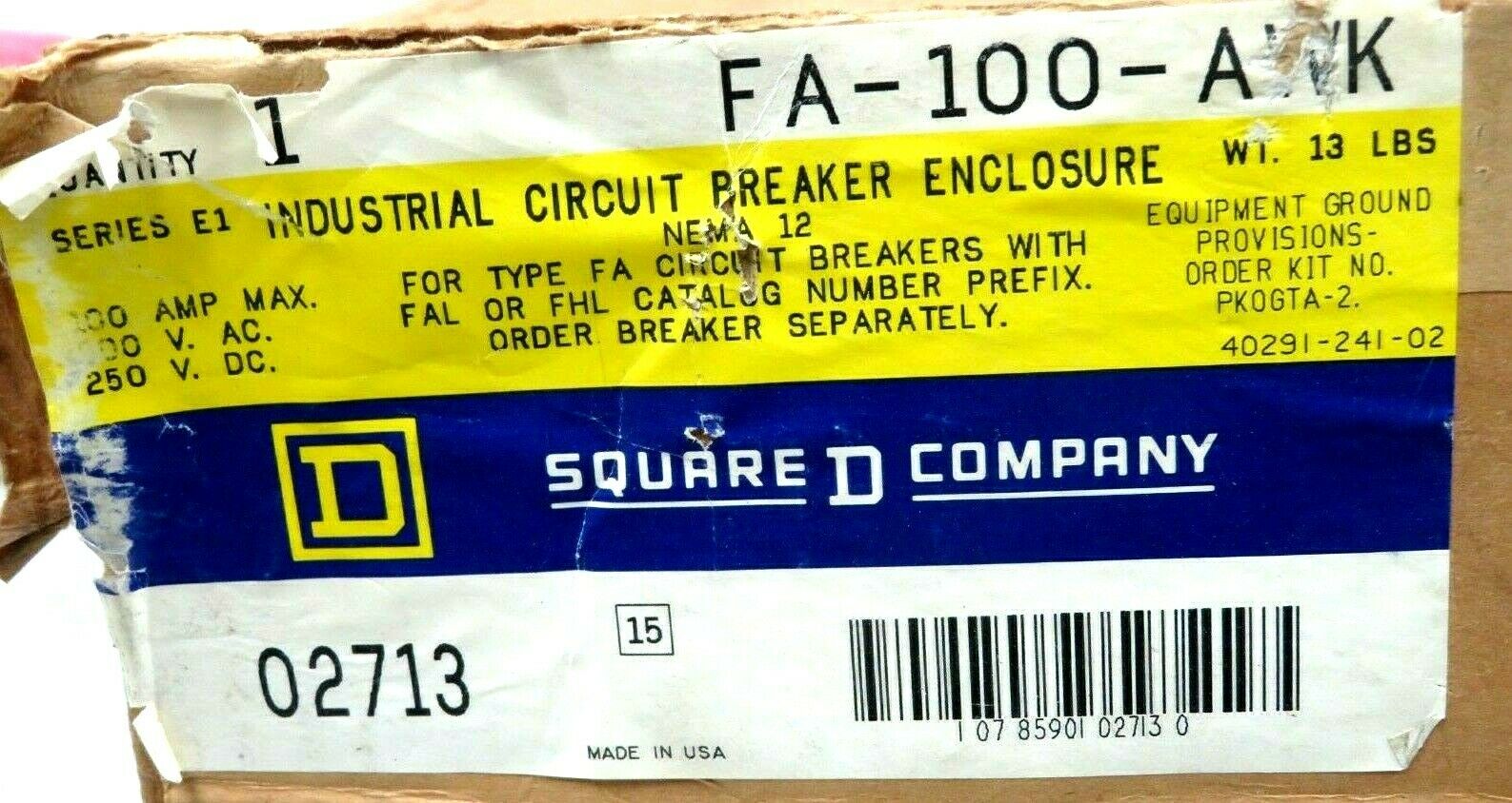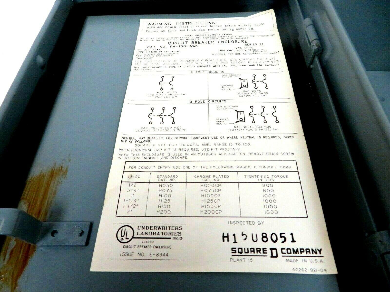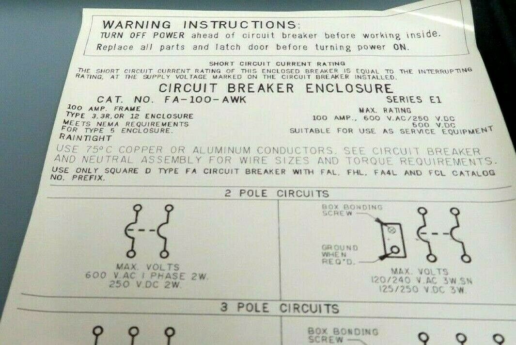 NEW SQUARE D FA-100-AWK CIRCUIT BREAKER ENCLOSURE FA100AWK