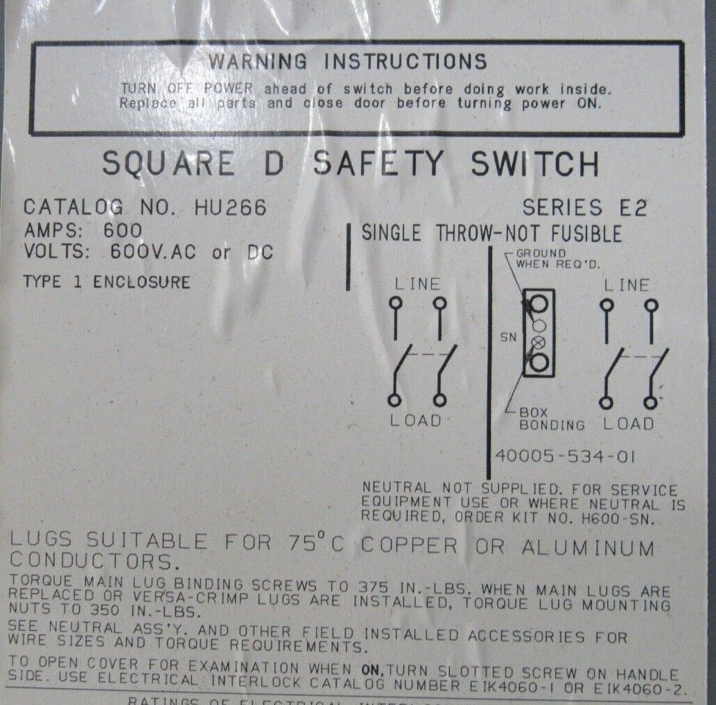 NEW SQUARE D HU266 SAFETY SWITCH 600A 600V SER.E2$900.00 Out of stock SKU: 195304740954 Category: Other Description Additional information Description NEW SQUARE D HU266 SAFETY SWITCH 600A 600V SER.E2 B3 BB Additional information Weight 160.00 lbs MPN HU266 Brand SQUARE D We Buy New and Used Surplus Inventory - Sell to Us