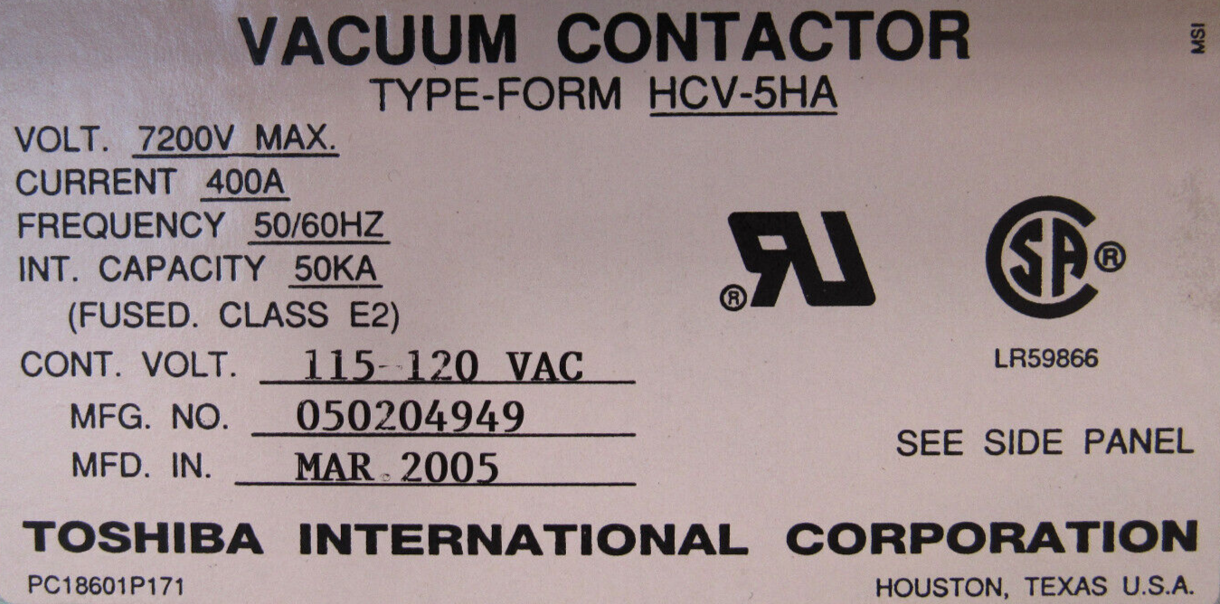 NEW TOSHIBA HCV-5HA VACUUM CONTACTOR 400A HCV5HA