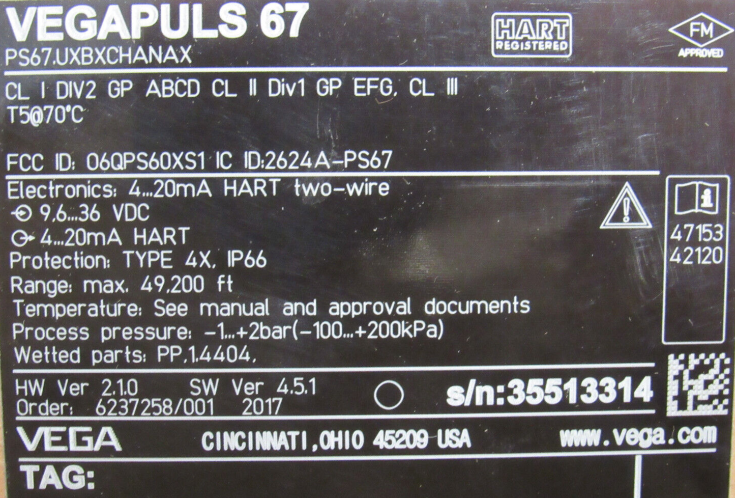 NEW VEGA VEGAPULS 67 TRANSMITTER PS67.UXBXCHANAX VEGAPULS67