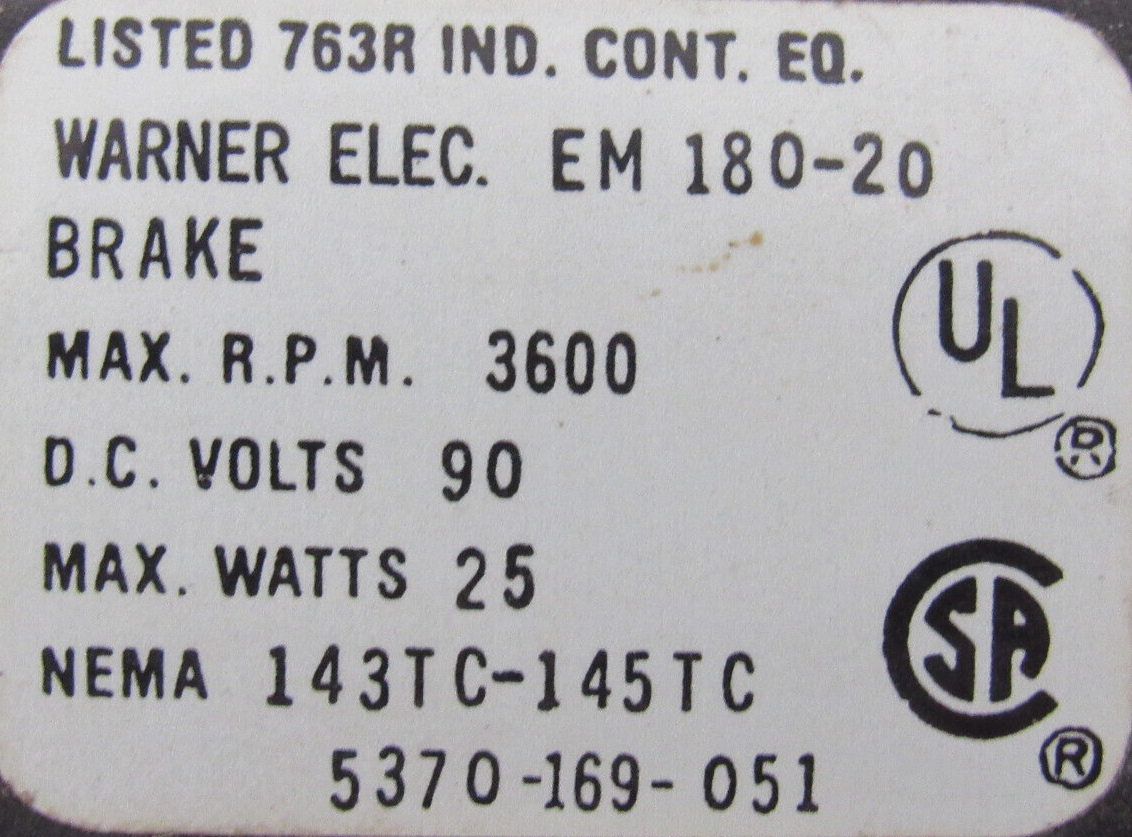 NEW WARNER ELECTRIC EM180-20 BRAKE 90VDC 3600 RPM 5370-169-051 143TC EM18020