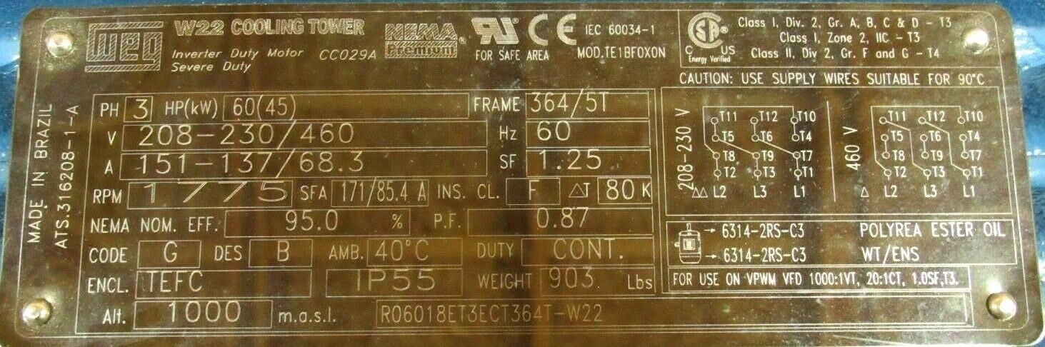 NEW WEG R06018ET3ECT364T-W22 MOTOR 60HP 208-230/460V 1775RPM 2-3/8″ TE1BF0X0N