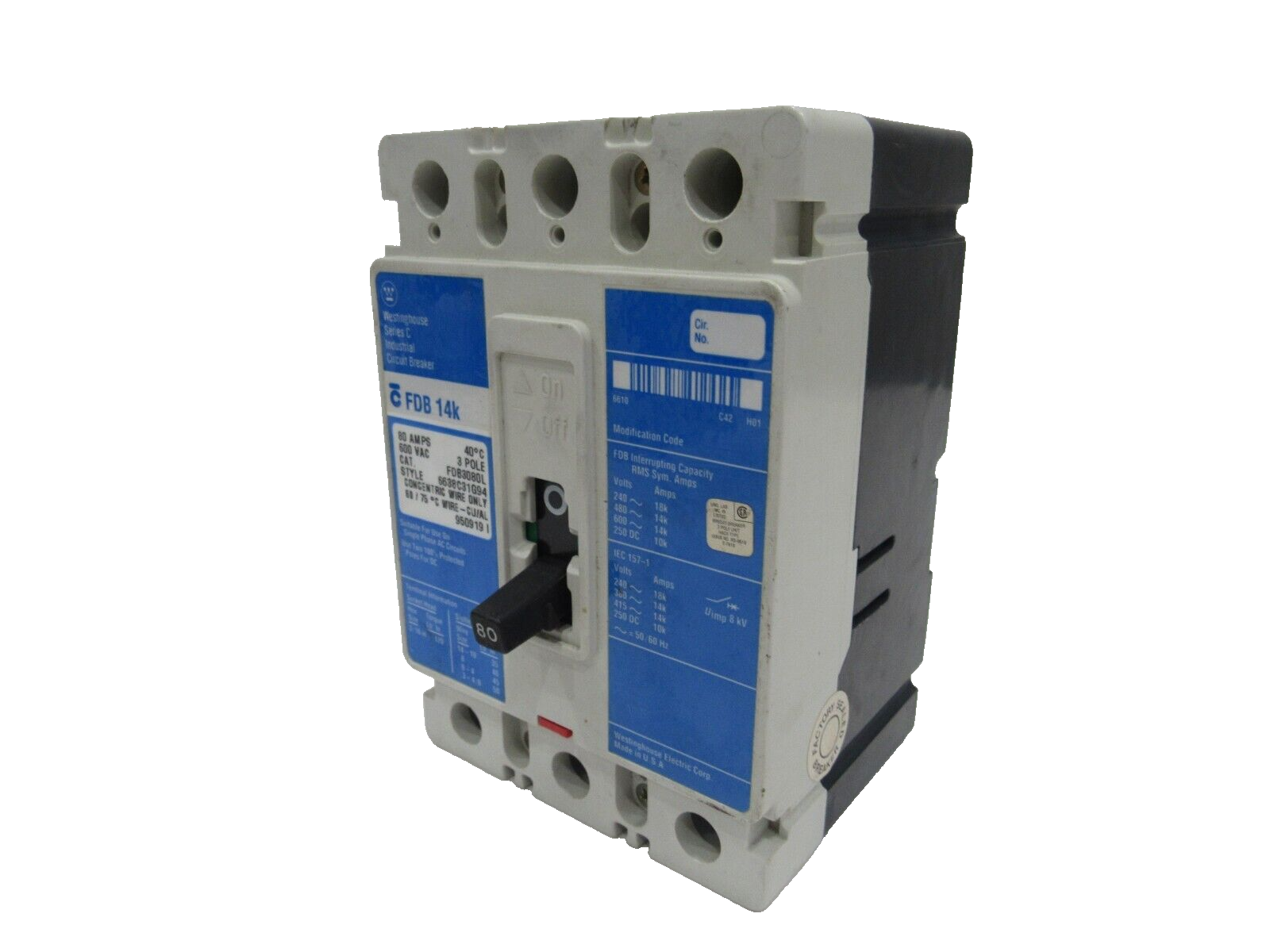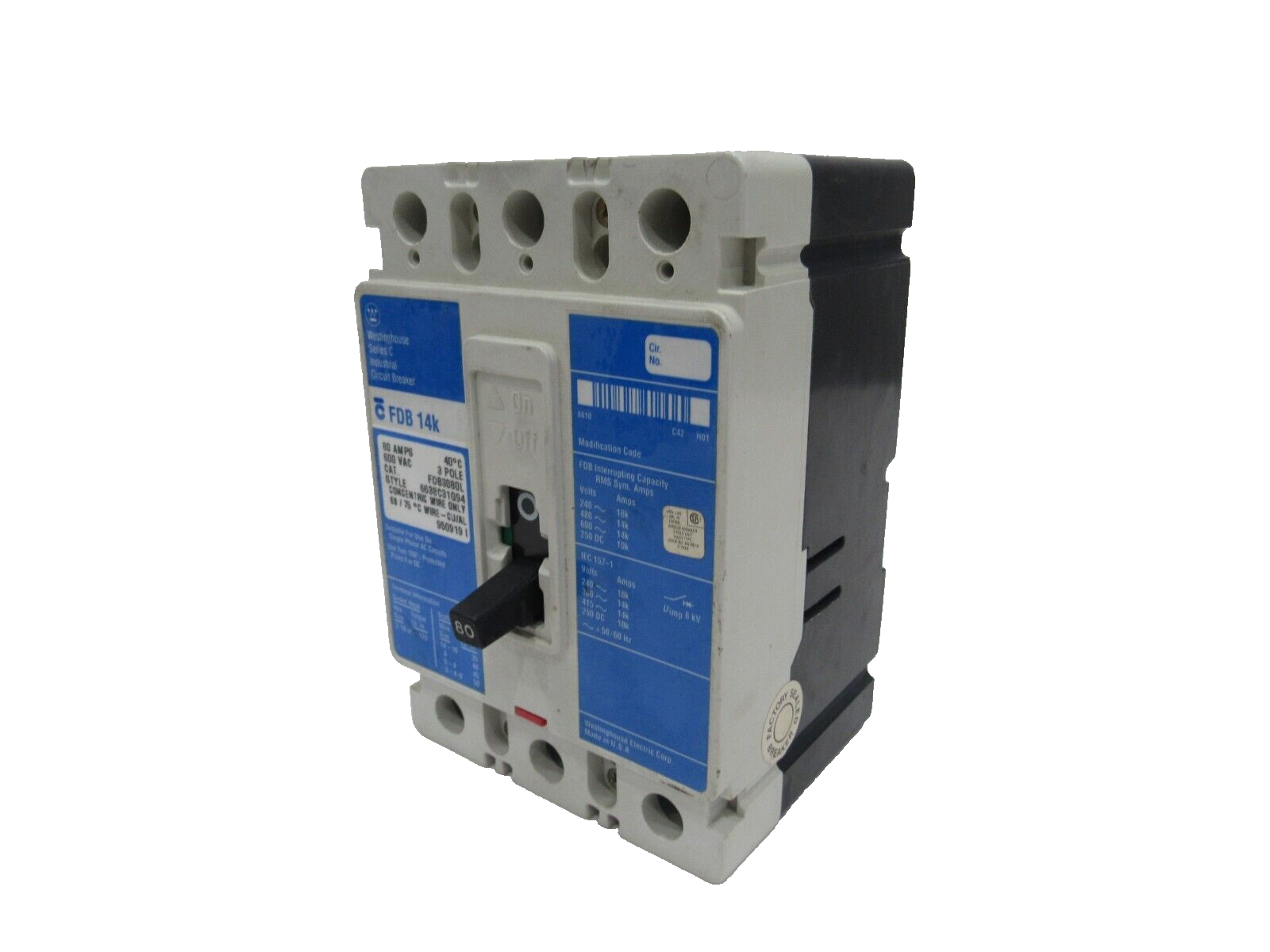 NEW WESTINGHOUSE FDB3080L CIRCUIT BREAKER FDB 14K 80AMPS 600VAC