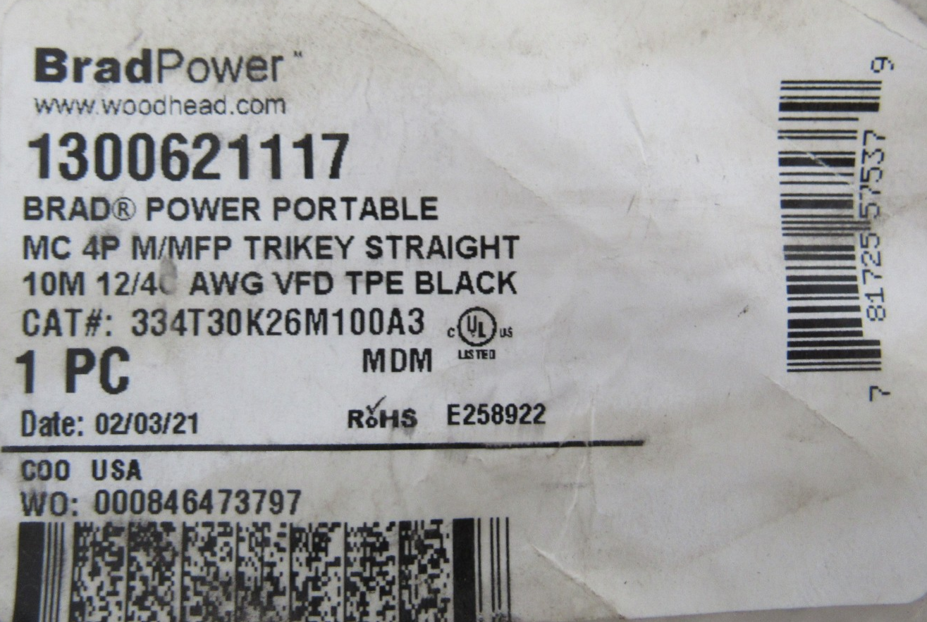 NEW WOODHEAD 1300621117 POWER CABLE 334T30K26M100A3 4P 10M 12/4CNEW, NO BOX