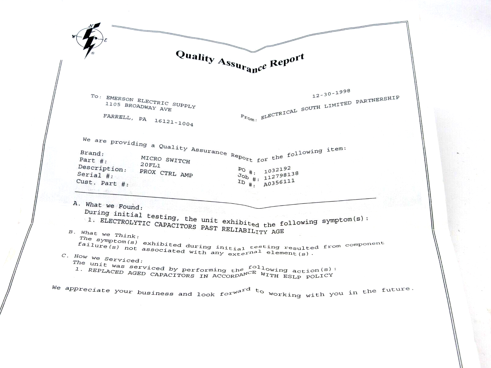 REFURBISHED HONEYWELL MICROSWITCH 20FL1 PROXIMITY CONTROL AMPLIFIER$95.00 Only 1 left in stock REFURBISHED HONEYWELL MICROSWITCH 20FL1 PROXIMITY CONTROL AMPLIFIER quantity Add to cart SKU: 195706327139 Category: Other Description Additional information Description REFURBISHED HONEYWELL MICROSWITCH 20FL1 PROXIMITY CONTROL AMPLIFIER521/BF Additional information Weight 3.00 lbs Brand HONEYWELL MPN 20FL1 We Buy New and Used Surplus Inventory - Sell to Us