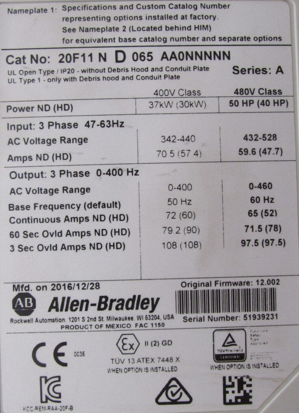 USED ALLEN BRADLEY 20F11ND065AA0NNNNN POWERFLEX 735 SER.A 50HP