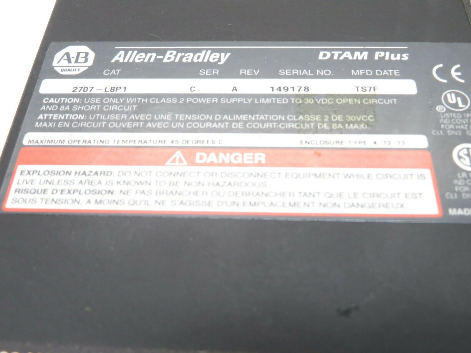 USED ALLEN BRADLEY 2707-L8P1 SERIES C REV A OPERATOR INTERFACE 2707L8P1