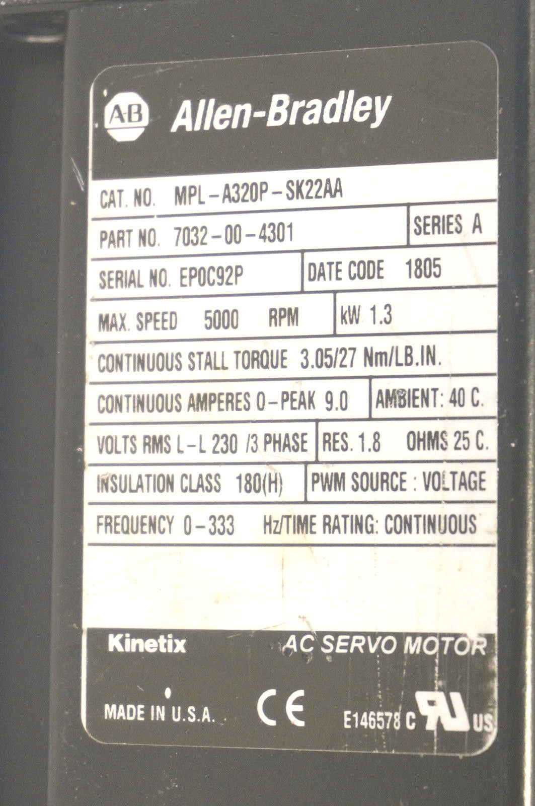 USED ALLEN BRADLEY MPL-A230-SK22AA SERVO MOTOR 7032-00-4301 MPLA230SK22AA