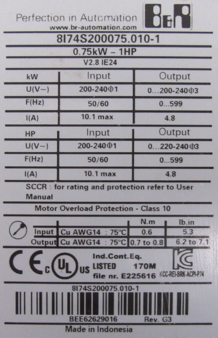 USED B&R AUTOMATION 8I74S00075.010-1 DRIVE 1HP BEE62629016 8I74S000750101