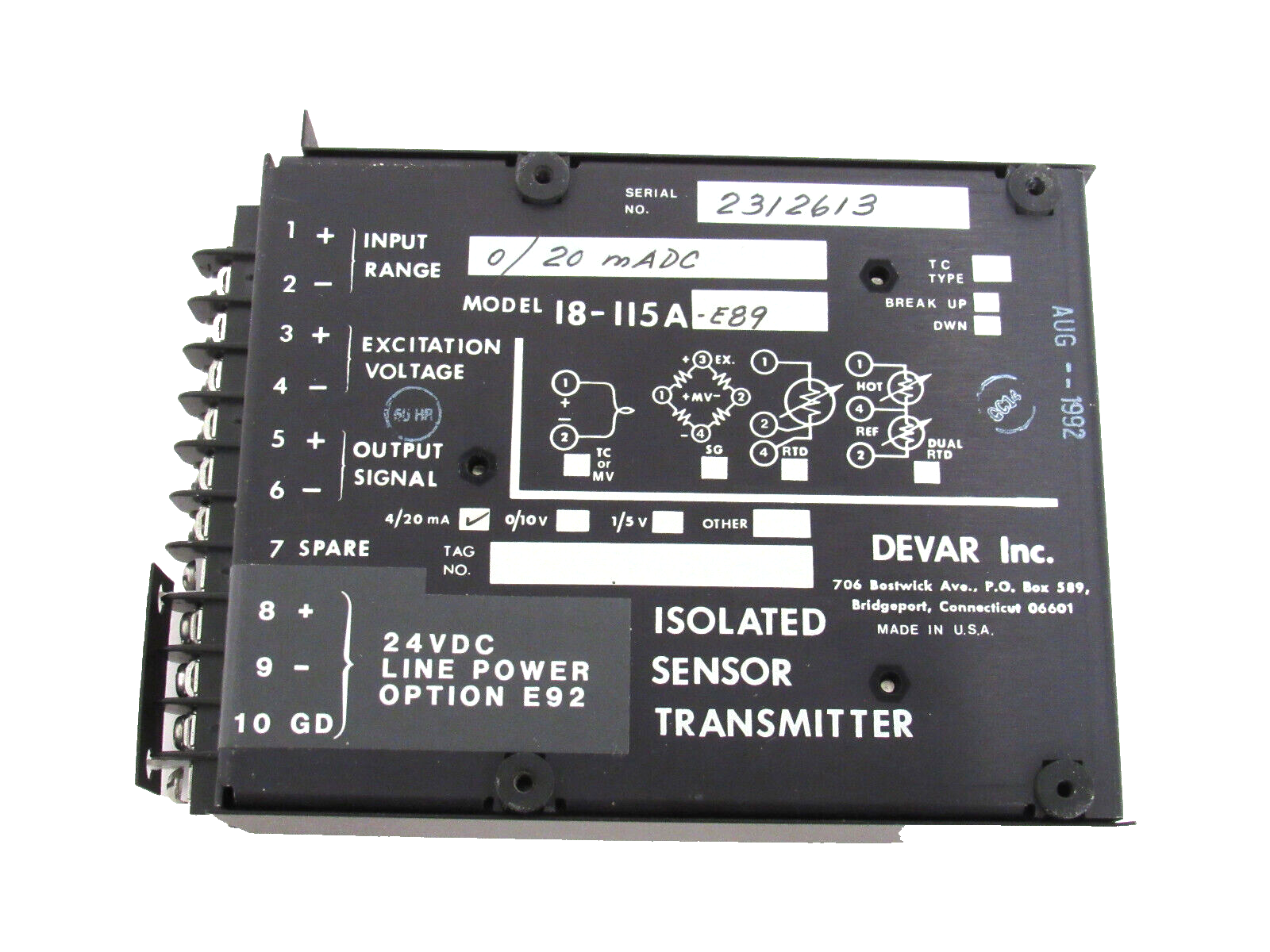 USED DEVAR 18-115A-E89 TEMPERATURE TRANSMITTER 18115AE89