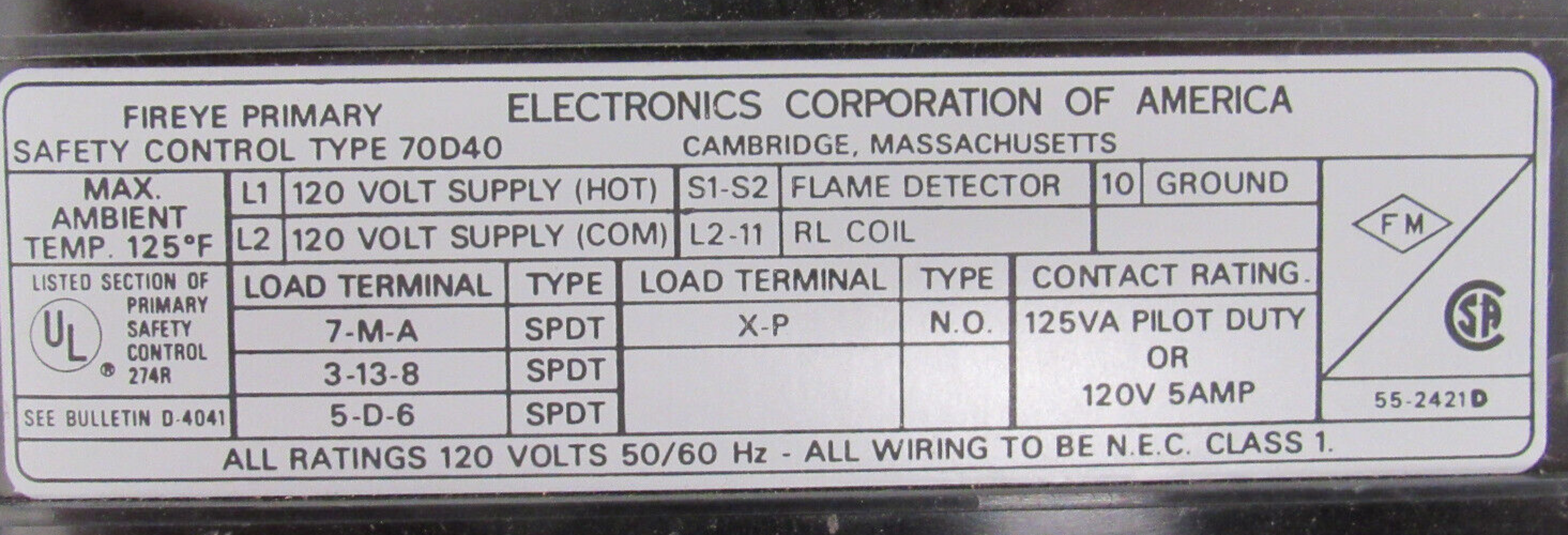 USED FIREYE 70D40 BURNER CONTROL SER. D