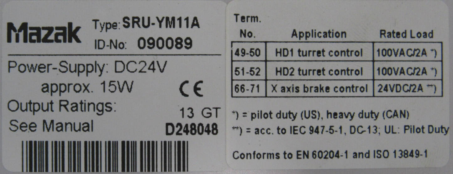 USED MAZAK SRU-YM11A SAFETY RELAY MODULE D70EU00936 SRUYM11A$750.00 Out of stock SKU: 354921413434 Category: Other Description Additional information Description USED MAZAK SRU-YM11A SAFETY RELAY MODULE D70EU00936 SRUYM11AB3/213 BB Additional information Weight 2.00 lbs Brand MAZAK MPN SRU-YM11A We Buy New and Used Surplus Inventory - Sell to Us