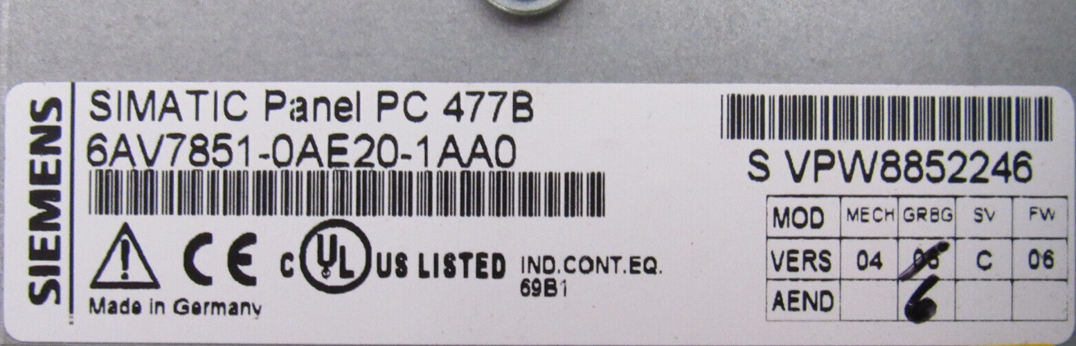 USED SIEMENS 6AV7851-0AE20-1AA0 SIMATIC PANEL 12" PC 477B 6AV78510AE201AA0