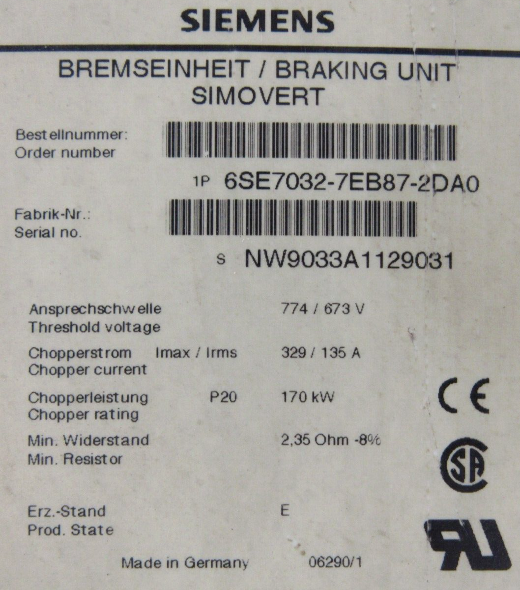 USED SIEMENS 6SE7032-7EB87-2DA0 BRAKING UNIT 6SE70327EB872DA0