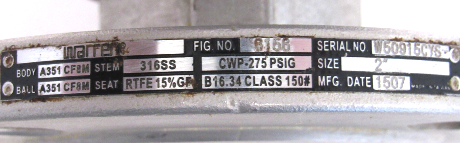 USED WARREN 6156 BALL VALVE 2"$100.00 Only 1 left in stock USED WARREN 6156 BALL VALVE 2" quantity Add to cart SKU: 197325581225 Category: Other Description Additional information Description USED WARREN 6156 BALL VALVE 2″ B3/135 BB Additional information Weight 21.00 lbs Brand WARREN MPN 6156 We Buy New and Used Surplus Inventory - Sell to Us